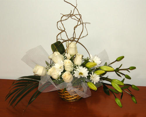 Delicado canasto con rosas y lilium que permiten reflejar cariño y apoyo en ocasiones emotivas.
