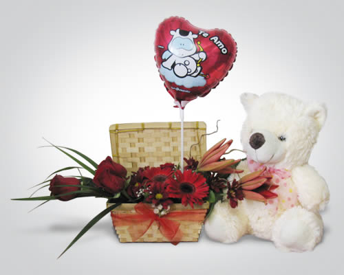 Regalemos este tierno canasto de rosas, gerberas, lilium y mables, adornados con un tierno peluche y globo.