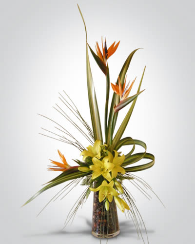 La hermosura de la naturaleza expresada en este diseño floral de estilicias y lilium, en un fino florero de vidrio.