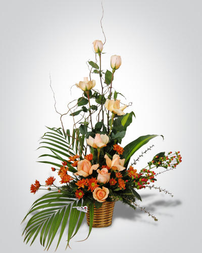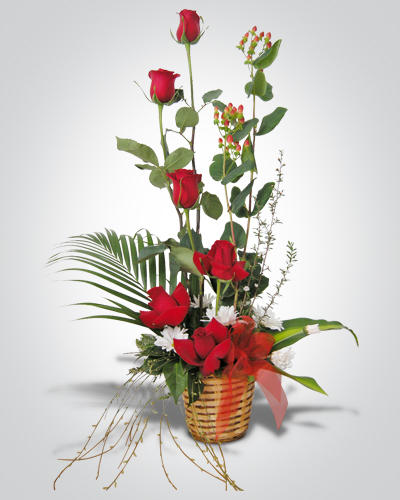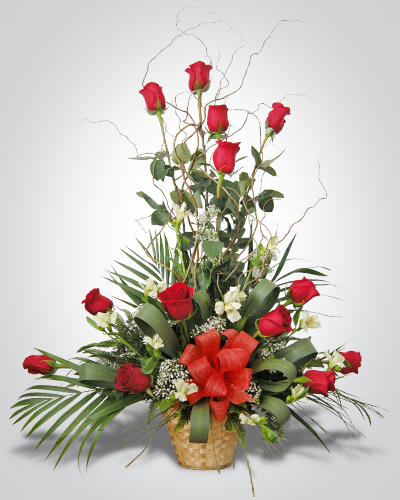 Demuestre todo el amor a través de este espectacular arreglo de doce rosas rojas en canasto, adornadas con astromerias y sauce.